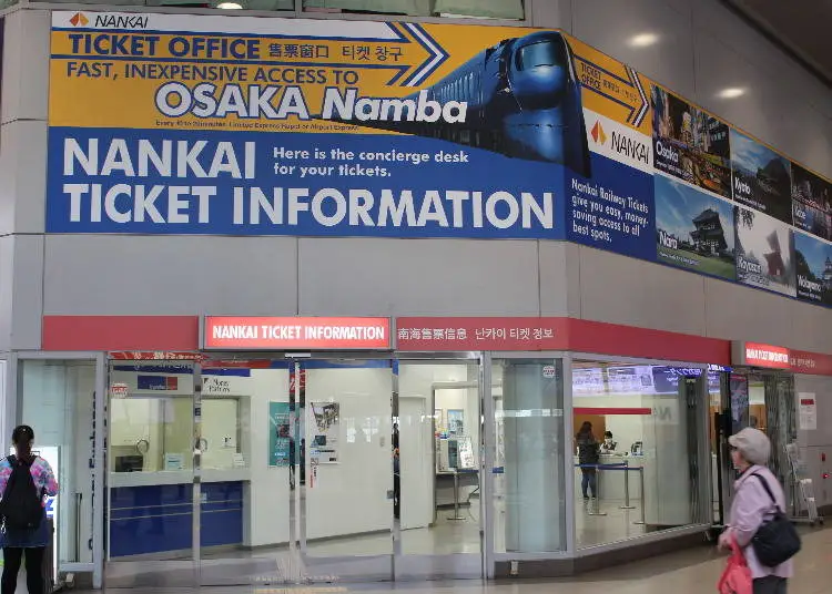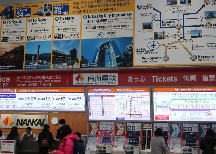 JR과 난카이 전철 각각의 티켓 판매대가 있으니 혼동하지 않도록 주의하세요. JR은 파란색, 난카이 전철은 오렌지색을 기본 색상으로 사용하고 있습니다. 급행이나 특급 열차의 경우, 승차권은 각 철도 회사의 티켓 판매기에서 구매할 수 있습니다.