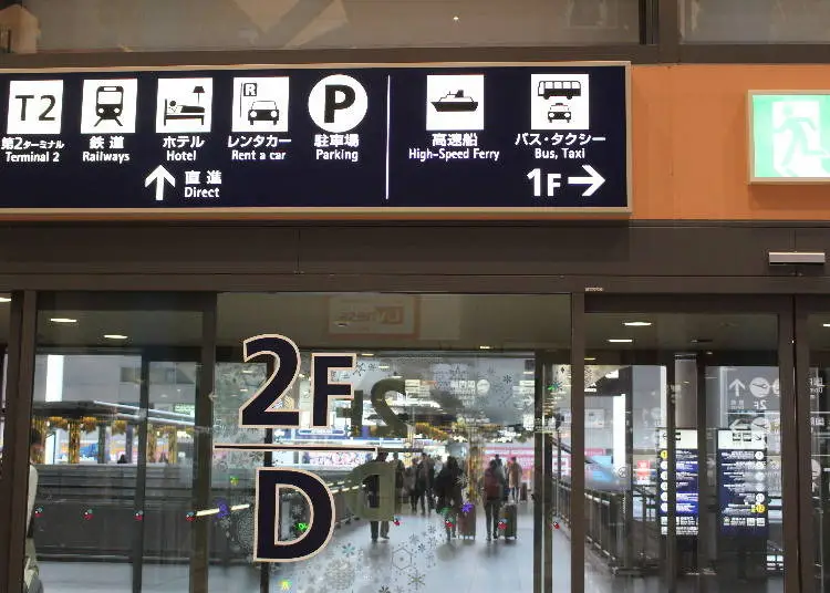 제1터미널 1층 도착구에서 에스컬레이터나 엘리베이터로 2층으로 올라가면, 2층 출구를 나와 연결 통로를 건너면 간사이 공항역이 있습니다.