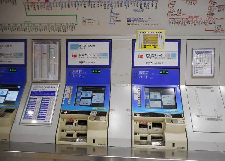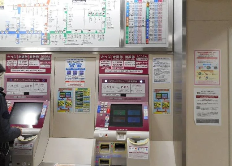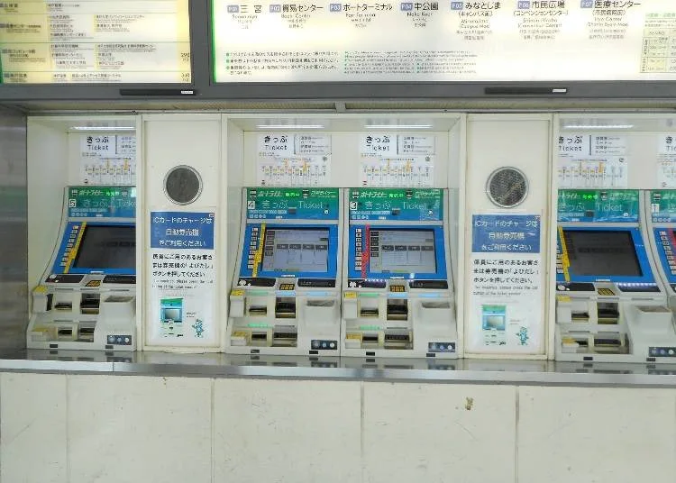 티켓 판매기는 영어, 중국어, 한국어를 지원하며, 동전, 지폐, 신용카드, 일본 내 교통용 IC 카드를 사용할 수 있습니다.