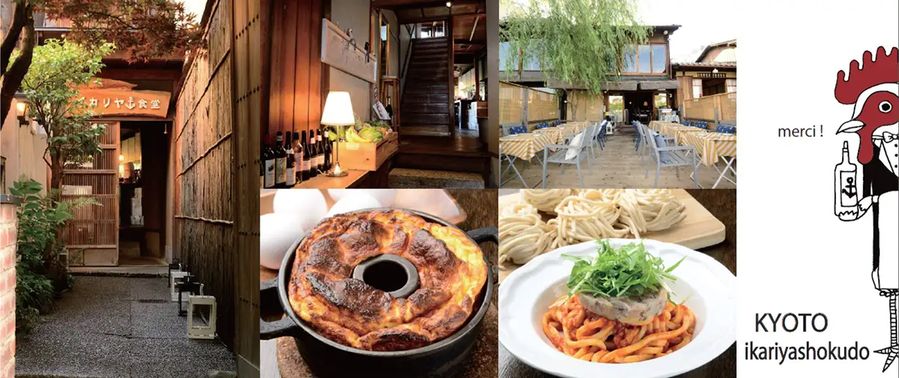 이 은신처 같은 귀여운 입구의 「이카리야 식당」은 놀랍게도 프랑스&이탈리아 요리를 즐길 수 있는 가게입니다. 지은 지 100년 된 교토 마치야 특유의 분위기와 서양식 인테리어가 멋진 공간을 연출합니다. 더욱 놀라운 것은 강변 좌석도 있다는 점입니다(9월 말까지).