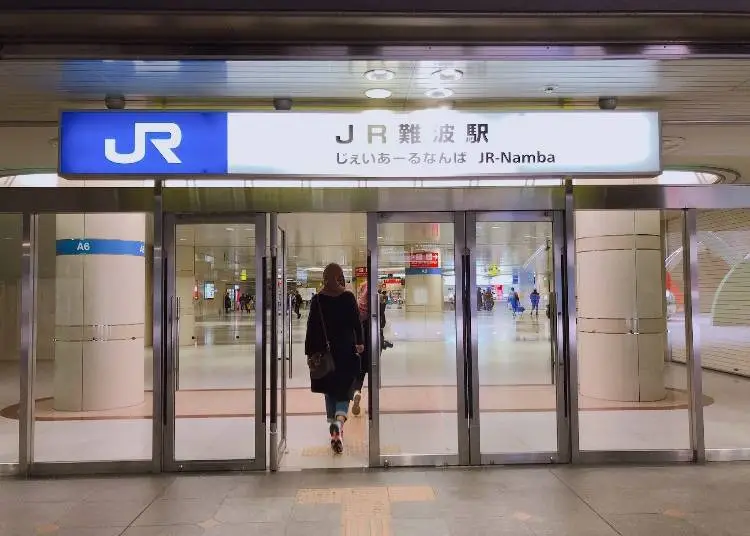 Osaka Metro 요쓰바시선을 지나 계속 직진하면 JR '난바역'의 입구에 도착합니다. 난카이 '난바역'에서 JR '난바역'까지는 모두 지하 상가로 연결되어 있지만, 도보로 약 10분 거리로 조금 멀기 때문에 급할 때는 주의가 필요합니다.