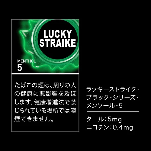 「럭키스트라이크 블랙 시리즈 멘솔 5」는 강한 멘솔감과 건조한 흡입감이 특징입니다. 저렴한 가격에도 불구하고, 진정한 맛을 즐길 수 있습니다.