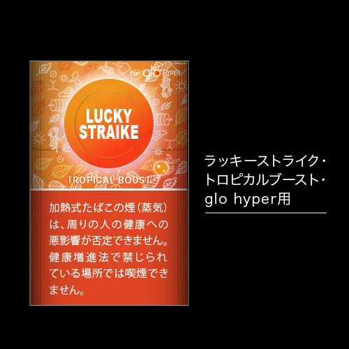 패키지를 열자마자 망고의 달콤한 향이 퍼지며, 캡슐을 깨면 파인애플 같은 신맛을 즐길 수 있는 「럭키 스트라이크 트로피컬 부스트 glo hyper용」.