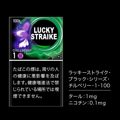 럭키스트라이크의 멘솔 시리즈 중 타르 함량이 가장 적고 유일한 롱 사이즈가 「럭키스트라이크 블랙 시리즈 칠베리 1·100」입니다.