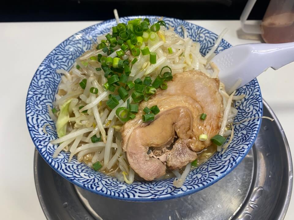 보시면 아시겠지만, 처음에 수북이 쌓여있는 숙주나물의 늪을 통과해야지만 면에 도달할 수 있을 정도로 양이 엄청난 것을 보실 수 있습니다! 또한 차슈 하나하나의 두께가 살벌하기 때문에 웬만큼 굶주린 상태로 가더라도 완식을 하기 장담하기 어렵다는 사실! 당시, 건너편에 있는 친구한테는 이 정도면 먹을 수 있지라고 약을 팔아서 곱빼기 도전시켰더니 산더미처럼 쌓여있는 것을 보실 수 있습니다