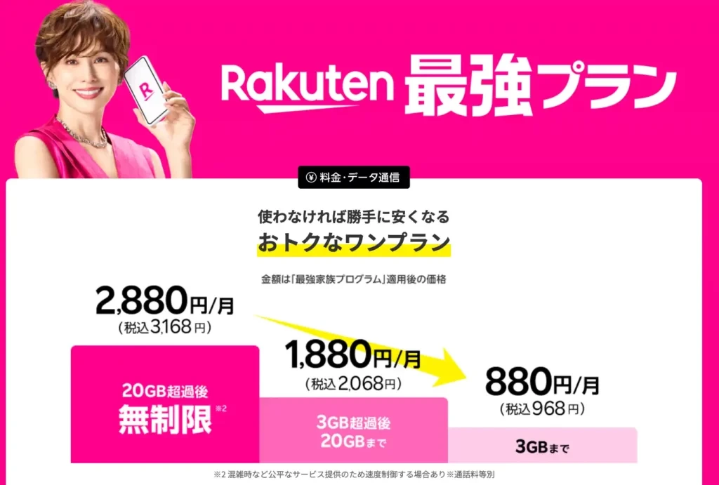 라쿠텐 모바일의 요금제는 다음과 위와 같습니다. 본인의 한달 데이터 사용량이 3GB이하라면 월 1078엔 (세금포함), 20GB까지 사용하였다면 2178엔 (세금포함), 그 이상은 얼마를 쓰던 무제한으로 월 3278엔 (세금포함) 요금이 나옵니다. 자신이 쓴 만큼 요금이 자동으로 산정되어 나오는 것이니 잘 조절해서 쓰면 꽤 값싸게 나옵니다. 또한 일본은 완전 최근에 법 개정이 되어 계약 해지시 해지요금이 없도록 바뀌었습니다! (유명한 알뜰폰 회사중 하나인 Ymobile 이 15GB 3278엔 (세금포함), 25GB 4158엔 (세금포함) 인것을 감안하면 꽤 저렴한 회사입니다 !!)