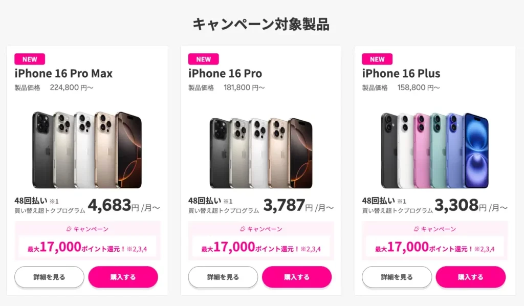 아이폰 16 시리즈 ( 16, 16plus, 16pro, 16promax) 구매시, 17000엔 분의 포인트 보너스를 받을 수 있습니다. 1포인트는 1엔분의 가치를 가지며, 요금 납부를 포인트로 대체해서 지불할 수 있습니다. 거기에, 48개월 분할을 이용하면 아이폰16프로 128 GB 기준 월 37엔 납부하면 됩니다.