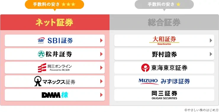 두 번째는 그림의 오른쪽에 있는 총합 증권입니다. 다이와 증권, 미즈호 증권, 노무라 증권 등등이 있습니다. 실제 오프라인 매장이 존재하는 만큼 수수료가 비싼 것이 단점입니다. 대신 온라인이 익숙하지 않다면 이쪽이라도 이용해야겠지요.