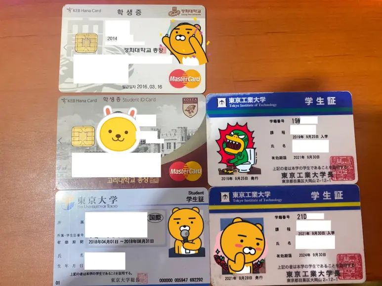 왼쪽 위부터  경희대 (14학번) ,  고려대 (15학번) ,  동경대 (교환학생) , 오른쪽 위부터  동경공대 (석사, 19년도 입학) ,  동경공대 (박사, 21년도 입학), (* 첫 전적대인 상명대는 아무리 찾아도 학생증이 보이지 않는다)