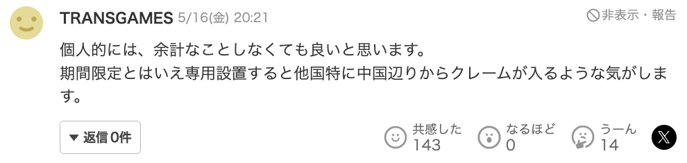 기간 한정이라 하더라도 전용 설치를 하면 다른 국가, 특히 중국 등에서 불만이 제기될 것 같습니다.