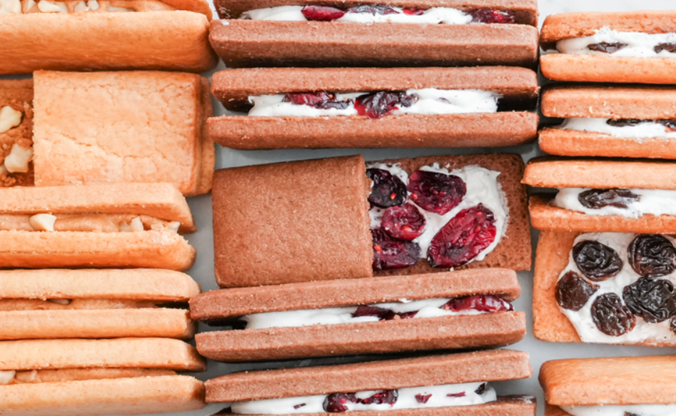 버터를 듬뿍 사용한 바삭한 사브레에 ‘건포도’, ‘크랜베리’, '소금 캐러멜 헤이즐넛'과 크림을 샌드한 '사브레 샌드'를 맛볼 수 있습니다. 향을 내기 위해 양주를 사용한 어른들을 위한 상품입니다.