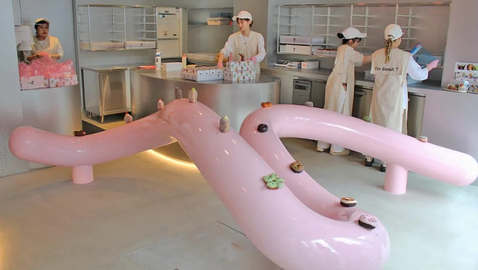 카운터 위에는 판매 상품과 같은 도넛 샘플이 진열되어 있어 기다리는 동안에도 흥미진진하게 즐길 수 있는 재미있는 장치가 되어 있습니다.