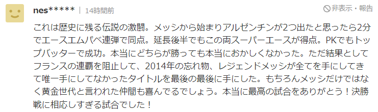 이것은 역사에 남을 전설의 격투. 메시로부터 시작해 아르헨티나가 2점을 넣었다고 생각하면, 2분 만에 에이스인 음바페가 연발로 동점. 연장 후반에도 이 두 슈퍼 에이스가 득점. PK에서도 톱 타자로써 성공. 정말로 어느 쪽이 이겨도 이상하지 않았다. 다만, 결과로써 프랑스의 연패를 저지해서 2014년에 이루지 못했던, 레전드인 메시가 단 하나 이루지 못했던 월드컵 우승 타이틀을 마지막의 마지막에 손에 넣었다. 물론, 메시뿐만 아니라 황금세대라고 불리는 동료도 기뻐할 것입니다. 정말 최고의 경기를 보여주어서 감사합니다! 결승전에 알맞은 경기였습니다.