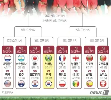 한국의 토너먼트 첫 상대는 그룹 G의 1위, 이것이 거의 확실히 브라질 대표인게 문제지만 말이죠...