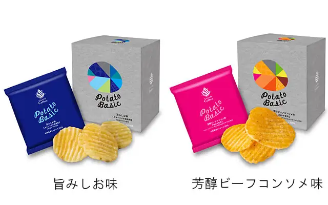 천천히 튀겨 감자의 감칠맛을 충분히 살린 'PotatoBasic'과 굽는 공법을 이용해 고소한 맛을 살린 'PotatoRoast'의 두 가지 공법이 있습니다. 각 라인에 소금맛, 간장맛 등 3 종류의 맛이 추가적으로 존재합니다. 한 상자 안에 3봉지로 나뉘어져 있는 구성이라 선물로 나누어 주기도 좋습니다.